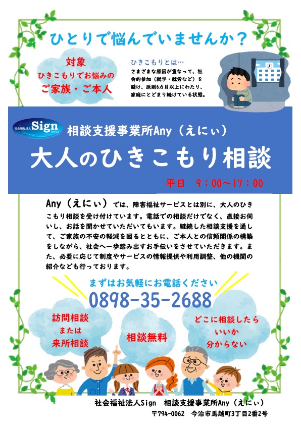 相談支援事業所Anyでは、子どもから大人まで幅広く、各ライフステージに沿って、生活のこと・はたらくこと・健康のこと・対人関係等に不安があるご利用者様に対し、相談支援を行っています。