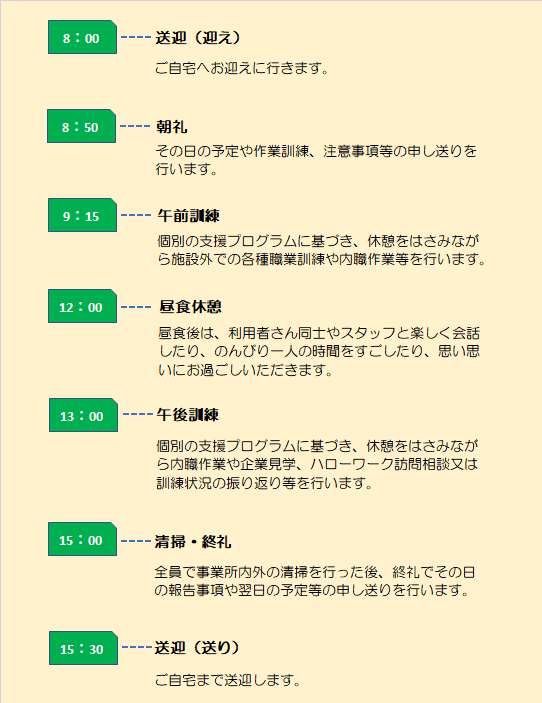 | 対象となる方 | 学校を卒業したが、就職に必要な体力や精神力が不足しており、これらを身に付けて就職したい方。 就職していたが、体力や職場環境等で離職した方で再度訓練を受けて適正に合う仕事に就きたい方。 施設や病院を退所し、就職を希望するが体力や能力に自信のない方。 その他、就職を希望するが自身での就職が困難と感じている方。 |